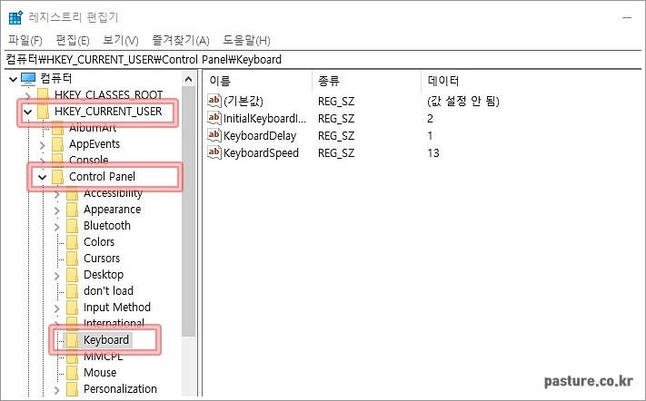 이 경로에서 여러분이 설정할 수 있는 여러 가지 값이 있습니다. 가장 중요한 값은 “RepeatDelay”와 “RepeatRate”입니다.